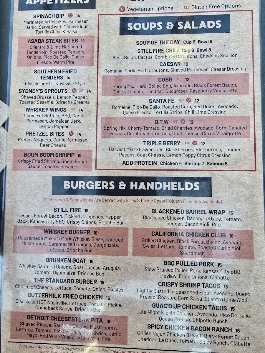 The burger selection is equally enticing. The Still Fire Burger is a must-try—an 8oz patty, accented with beer-battered jalapeno coins, crispy bacon, and pepper jack cheese, finished with a drizzle of their signature BBQ sauce, all snug atop a brioche bun for $14.00. Meanwhile, the Bacon and Egg Burger and the unique Whiskey Burger, which is enveloped in a rich Jameson whiskey glaze, promise to tantalize your taste buds.